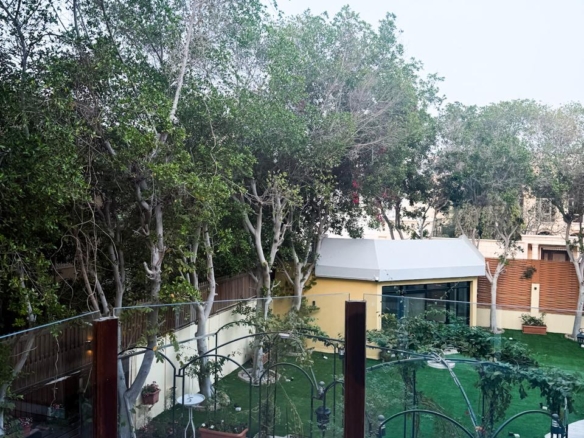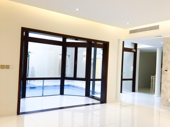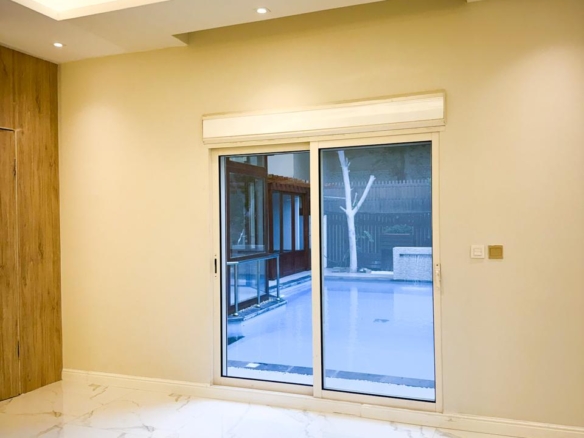 🪟 واجهات زجاجية كاملة تطل على المسبح والحديقة